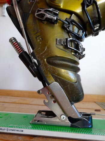 To access the free pivot, slide back a stainless steel piece in front of the toe with your ski pole. When it’s forward it’s in ski mode, when it’s back, it’s in tour mode. It takes a minute to get used to, but it’s simple to do.
