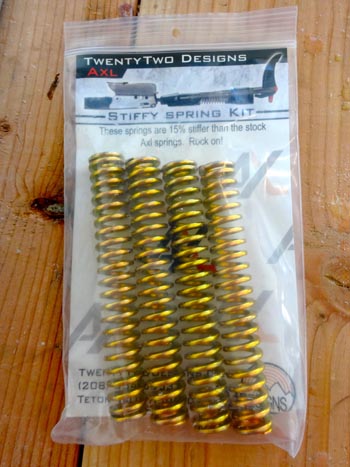 The Axl comes with “normal” chrome die springs, but you can upgrade to the “stiffy” springs if you want too. Those cost $35. The springs have 2 inches of travel in them. This allows for a smooth sensation throughout the entire turn.