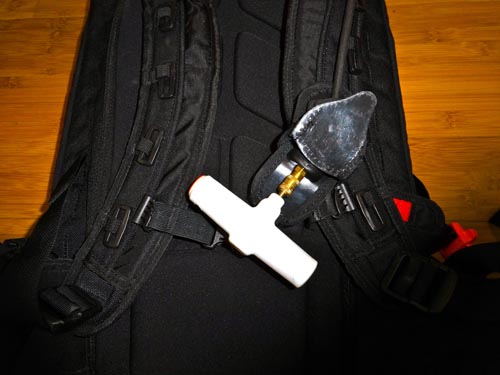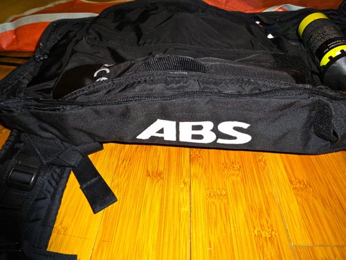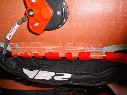 The trigger is easy to pull – your grandmother could do it. It’s a bit bulky, but for mitten wearers this is a nice feature because it’s easy to grab and yank when disaster strikes. When pulled, a small explosive charge travels down the line to the compressed nitrogen cylinder. This punctures the cylinder and inflates the airbag. It’s a quick process (approximately 4 to 5 seconds from trigger pull to full inflation), but the explosive charge and closed cylinder make air travel difficult. There is also a wireless activation option available from ABS.