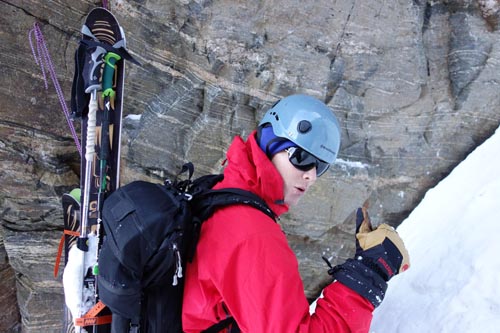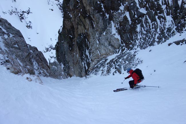 From the hole we kicked off some snow and Anton gave the couloir a quick ski cut. Conditions looked good. It was perfect chalky couloir snow – edgeable, forgivable, and stable. Yes!