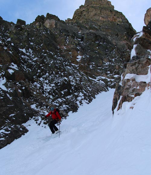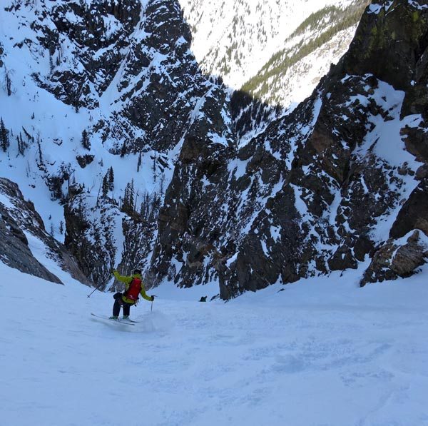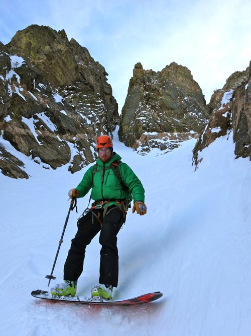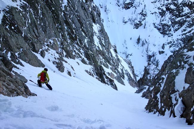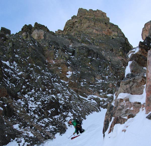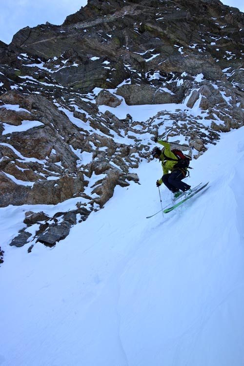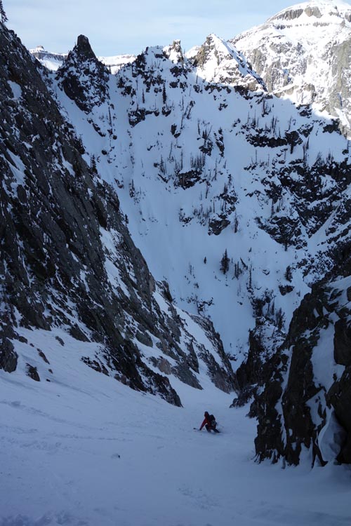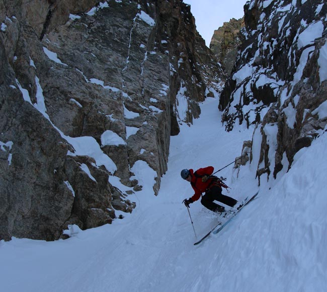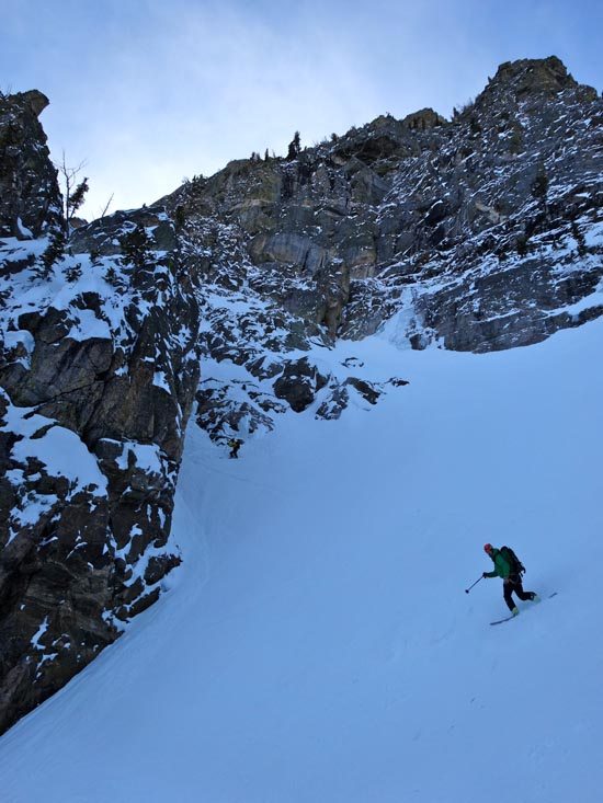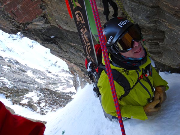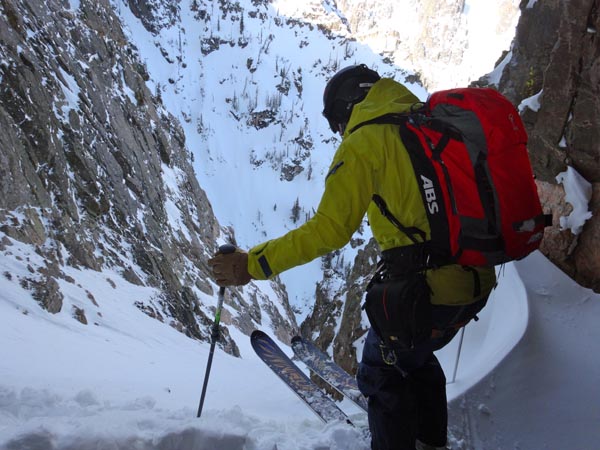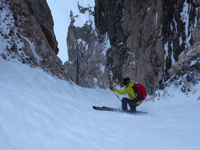 From the hole we kicked off some snow and Anton gave the couloir a quick ski cut. Conditions looked good. It was perfect chalky couloir snow – edgeable, forgivable, and stable. Yes!