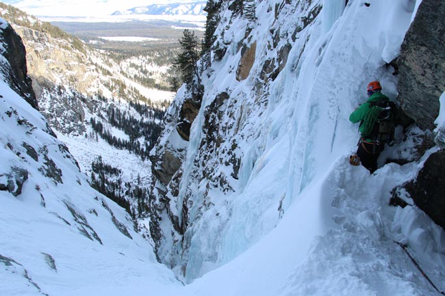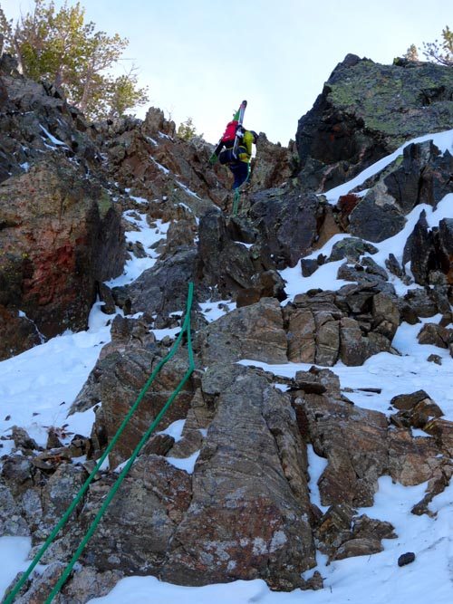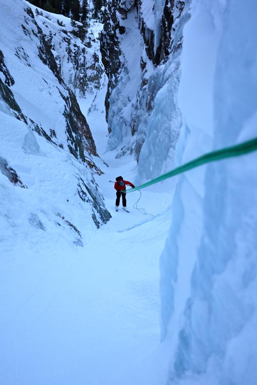 Moving onto a small ledge, Aaron made a quick v-thread and we rapped over the ice through this tight constriction with skis on. Below the ice was a funky double fall line that tested the camber of my Liberty Variant 97 skis and was barely skiable. I was glad to have my BD Whippet to help me sideslip through that section.