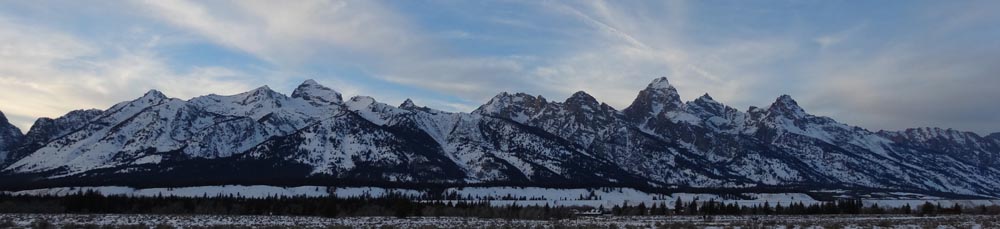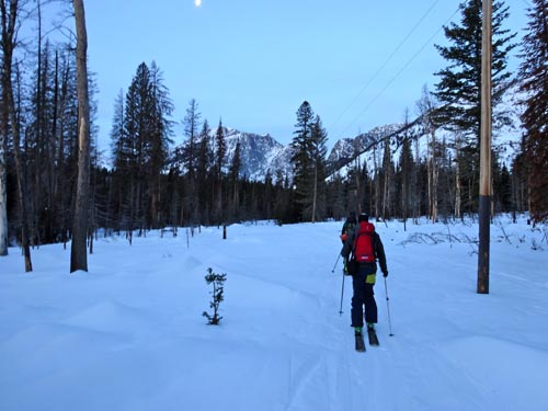 We parked on the plowed out section of Moose Wilson Road near the Whitegrass Ranch. We quickly clicked into our bindings and set off down the trail following the power lines as the alpenglow hit Albright Peak.