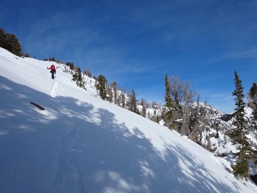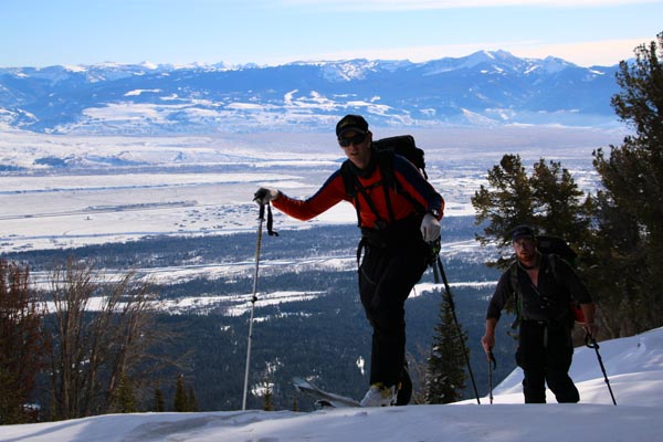 We quickly made it to the Phelps Lake overlook, where we ripped skins and skied about 600 vertical feet. We moved quickly across the southern runout zone of Albright – a frequent flyer in the Tetons. Crossing the mouth of Death Canyon, we began the skin up the eastern flanks of Prospectors Mountain.