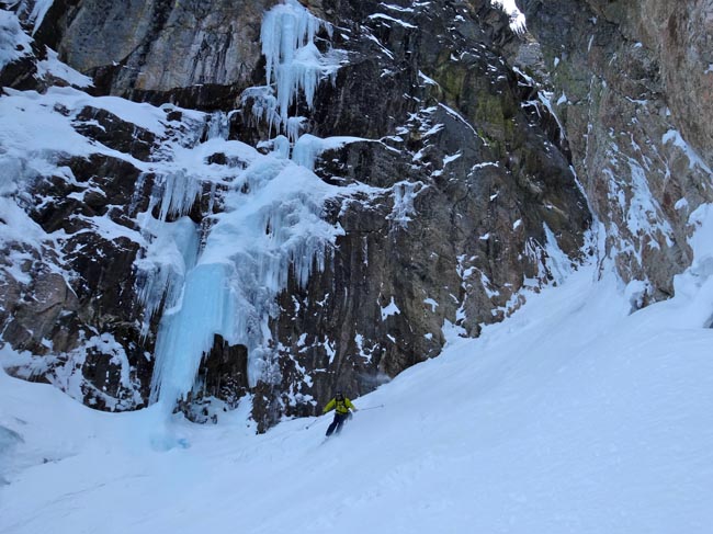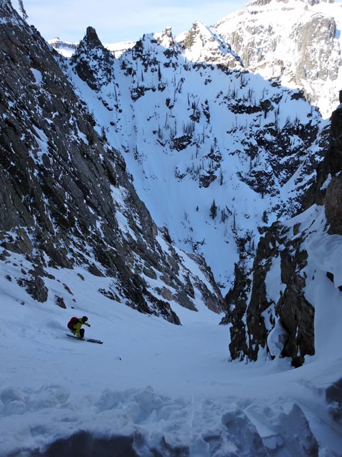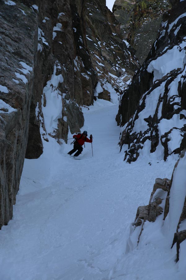 We continued to move down the couloir doing our best to leap frog from safe zone to safe zone. Eventually the couloir rolls over to about 55 degrees and entered a steep and narrow section above the dogleg. There was no room for error through this section that was no wider than an elevator shaft.