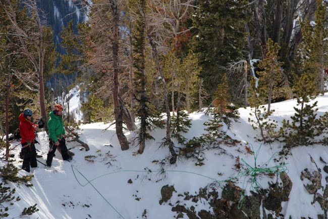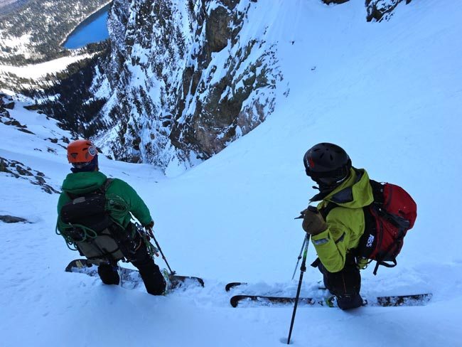 When we finally reached the top at approximately 10,000 feet, we peered down the north face of Prosepectors Mountain. The stoke factor was up as we trundled some rocks down into the couloir to test the snow.