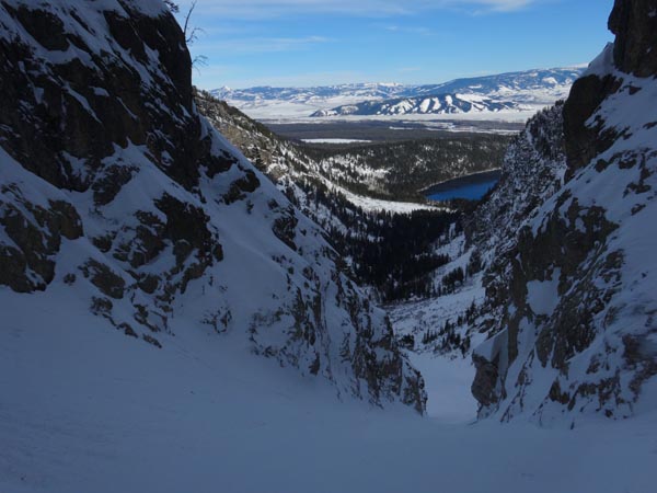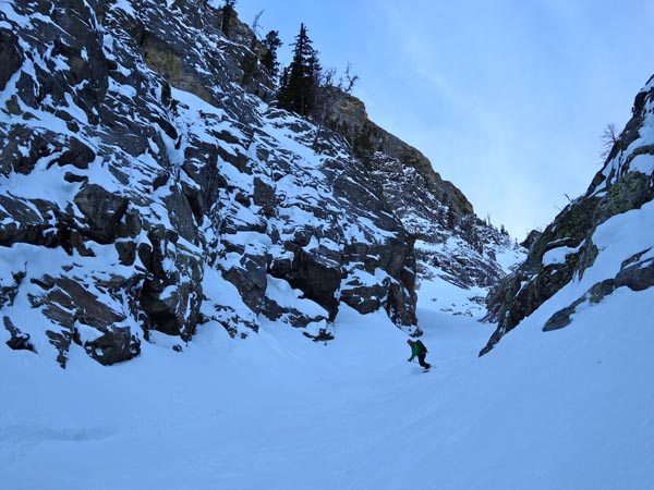 At the next island of safety, we regroup and skied the remainder of the couloir. It quickly opened up on to the debris on the apron and we cruised on down to the floor of Death Canyon.