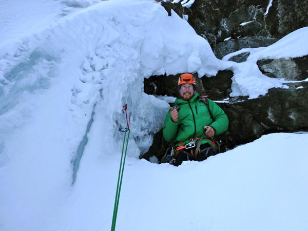 At the dog leg, the Apocalypse Couloir opened up and mellowed a touch, but a massive south facing wall now loomed overhead. We moved quickly down to the crux of the couloir – a final rappel over a section of blue ice. The shiny glare warning us of its presence from far above.
