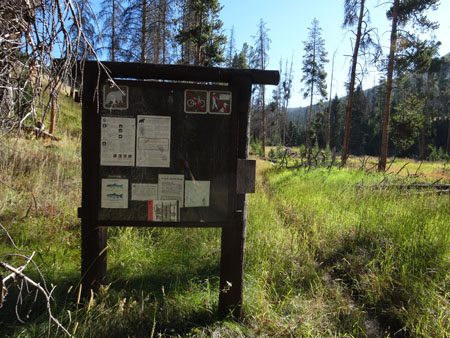 The Black Butte Trail roughly follows Black Butte Creek into the mountains. It wanders across meadows and through pine forests as it slowly climbs. After 1.9 miles and about 600 feet, you reach a trail junction with an engraved sign telling you where to go and distances in both miles and kilometers.