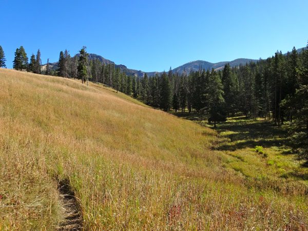 In the last mile or so of trail, the pitch ramps up and you quickly cover about 800 feet. The forest opens up into wide open meadows at about 9700 feet. This is also where the trail ends. It’s up to you to make it from the top from here. Don’t worry there are no tricks.
