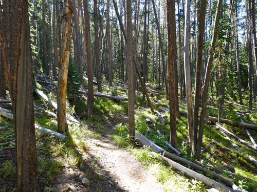 The trail continues to skirt across meadows and through forests. Shortly after the trail junction, you’ll see a sign for WF1 – a campsite about .2 miles off the trail. You need a backcountry permit to camp within Yellowstone Park boundaries.