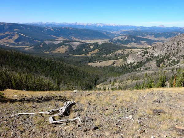 Yellowstone National Park spreads out to the south and west. The Absaroka Range is on the far side of the Paradise Valley. Ramshorn Peak is just to the north as is the majority of the Gallatin Petrified Forest.