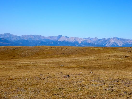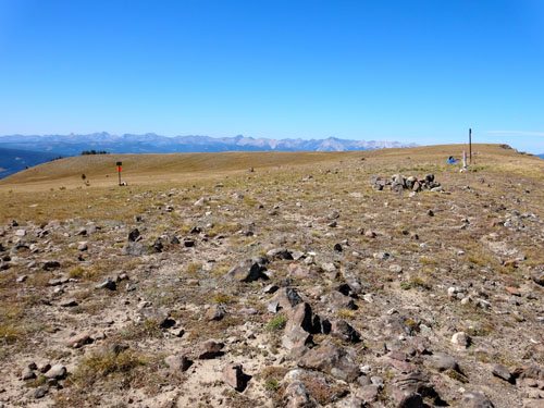 It all depends on what map you use. According to the Big Horn Peak USGS topo map, this rolling meadow in the sky is labeled Big Horn Peak at 9,888′. Cairns mark this location as do signs notifying you that you’re entering Yellowstone National Park. But according to other maps, Big Horn Peak also has a second, craggy summit to the west. This summit sits at 9,930′ feet. To reach it, follow the Sky Rim Trail across a rocky and exposed section for about .25 miles to the top. Whichever summit you reach, the views are spectacular, but due to their proximity you might as well bag them both.