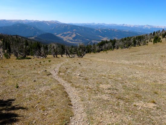 The meadow is wide open and a few cairns and lingering trees mark the way. After 3250 vertical feet and six miles, you finally reach the top at 9,888′. This is where you intersect the Sky Rim Trail – a 20 mile lollipop hike through Yellowstone. But I also feel that at this point, Big Horn Peak gets a bit confusing…