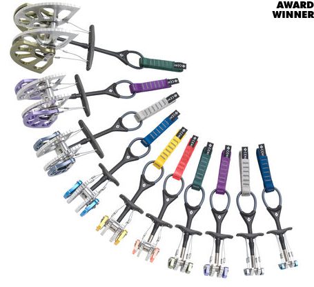 When the Black Diamond Camalots are clipped to your rack, they are easy to select as both the cam lobes and the durable nylon sling are color coded – .3 – Blue, .4 – Grey, .5 – Purple, .75 – Green, 1 – Red, 2 – Yellow, 3 – Blue, 4 – Grey, 5 – Purple, 6 – Green. If you pick up a rack pack of color coded Neutrino Carabiners or Oz Carabiners, you’ll have one sweet package for rock protection.