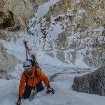 We hung out in the sun for awhile while we sorted gear for the climb ahead. We all soaked in some vitamin D, while Stu called in sick from work. I guess this skiing the Grand qualifies as “being sick”. Right? The bottom of the Stettner was quite boney. I don’t think it really sees enough sun to form good ice until later in the year. Due to the lack of ice we soloed over a couple of rock steps to the bottom of the Chevy. Luckily, the Chevy was quite the opposite of the Stettner and was full of quality ice. From the bottom of the Chevy, we could see three vertical steps between 5 and 7 feet with mixed ice and snow in between. We decided as a group to belay the first pitch and off we went.