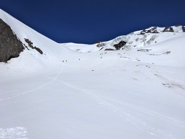 We transitioned to uphill mode and worked our way diagonally across the Nisqually and on to the Wilson Glacier. Then we pushed onwards to a mellow and safe ridge (7400′) between the Wilson Glacier and the Van Trump Snowfield. Due to the early morning heat, we were glad to be in a safe spot on a big mountain.