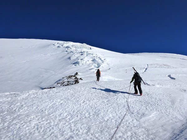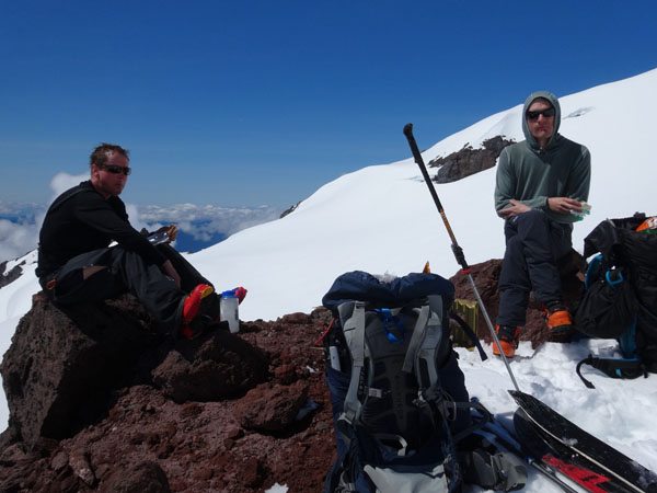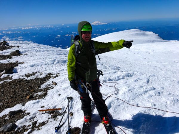 All roped up we climbed over one last steep headwall and then went back to skis for the final summit blast. After end running several large crevasses, we finally summited the Columbia Crest (14,416’| 4392 m) seven hours after we left camp. This was the highest I had ever been. Despite the constant wind, we had made it. Now we had the biggest ski line of my life to ski down.