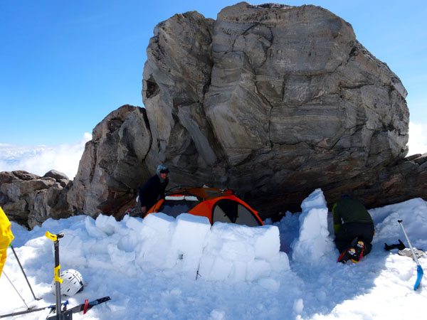 From here it was easy skinning toward our camp at upper Castle (9400′) below the Turtle. It took 4.5 hours, 4270′ up and 295′ down to reach camp. We found a great campsite on the upper gendarme. We dug in and build a highly protected campsite with a impressive snow wall. Our campsite was about 200′ higher than necessary, but it was by far the best site around.