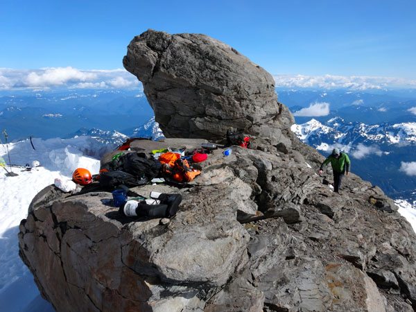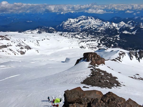 We got busy melting snow, drying skins, and enjoying the excellent views of the Fuhrer Finger, the Fuhrer Thumb, Wilson Headwall, Kautz Glacier, the Nisqually, and other terrain features of Mount Rainier. Towering almost a mile above our head was the summit of Rainier. The scale on this mountain is unreal.