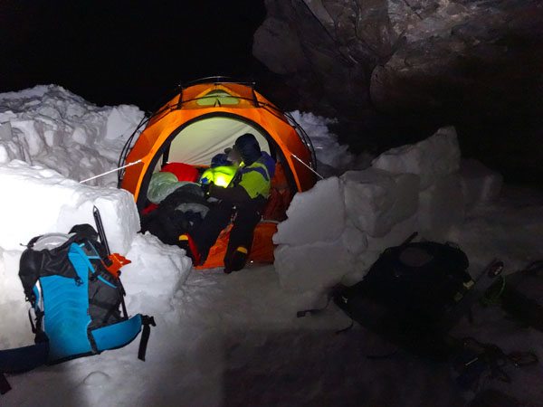 Other skiers and climbers were trickling into camp, as we enjoyed a tasty Mountain House meal before our 6 PM bed time. Our plan was to wake at 3 AM to start our ascent. We hope that we would time it right – frozen snow in the couloir, timely summit, and hit soft snow on the way out.