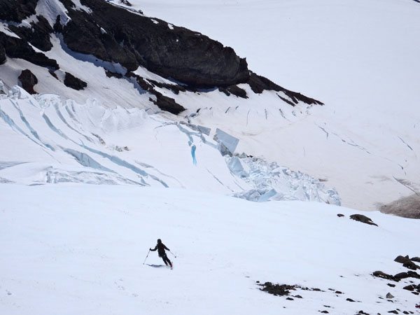 Breaking down camp, drinking water, eating snacks, and packing backpacks took a little bit of time. When we were ready we followed our ascent route from the other day back down the flanks of Mount Rainier. As we reached the lower Wilson Glacier, the isothermic snow was becoming unsupportable. Combine that with heavy packs and it definitely made for tough skiing.