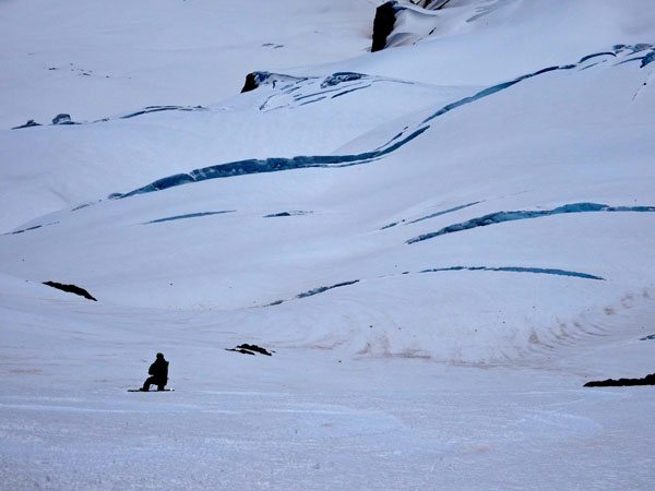 After double checking that we had everything we needed we walked back to the Paradise visitor center and toured from the parking lot. It was busy as we worked out way up toward Glacier Vista (6400′) to the west of Panorama Point. Here we ripped skins and skied down to the lower Nisqually Glacier at 6150′.