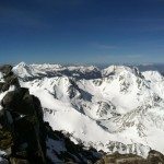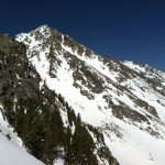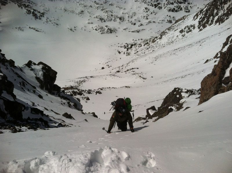 The next day we started out skinning, but quickly switched to crampons. The snow was mostly supportable, but would sometimes collapse underfoot making for unpredictable steps. Eventually we summited Gallatin Peak at 11,020′. The views were outstanding. There is so much to ski in the Spanish Peaks – none of it easily accessible. There were great views of both the Bat Ears and glimpses of Hanging Garden.