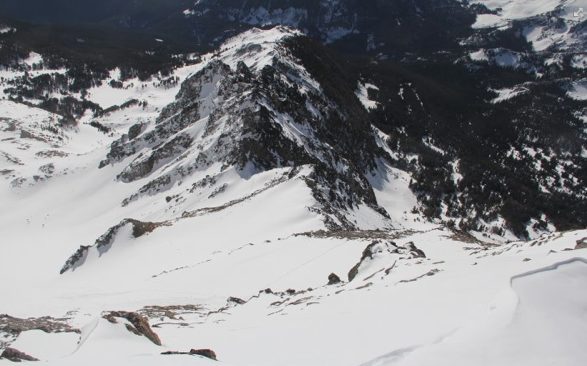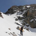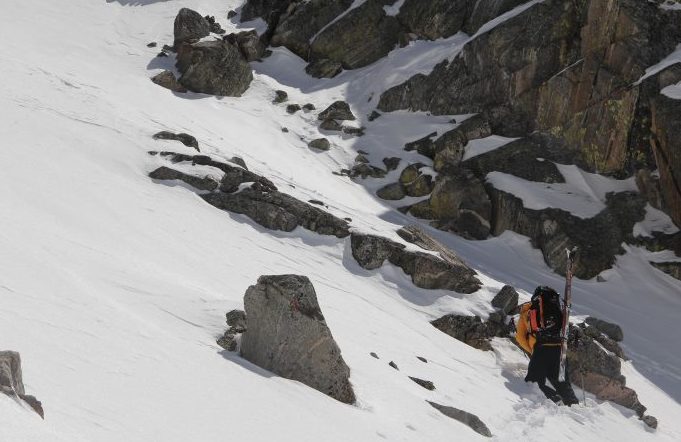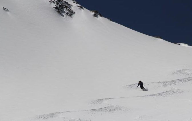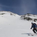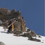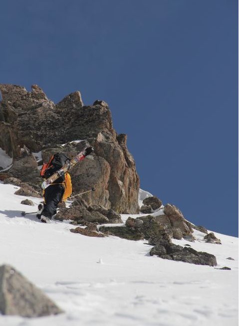 When quickly clicked into our Dynafits and had some route-finding decisions. We ultimately skied a short section of the East face before rounding the shoulder to the SE Face. This allowed us a short down climb over unstable rocks. Once on the face, we made the well deserved turns back to camp. The SE is face is a wide opening face that has a consistent pitch for the entire 2000 vertical feet. Safe snow conditions that had nicely softened in the morning sun made for epic conditions.