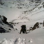 Skiing Gallatin Peak can be done in a day, but it would be a massive day. Micah and I decided to make it a multi-day trip. We took a round about way to Gallatin Peak. Starting early in Beehive Basin we skinned up the Basin to the north saddle where it joins Mirror Lakes and the South Fork of Spanish Creek. Then we skied some lovely snow down and skinned up to Summit Lake – a spot with outstanding views of Gallatin’s Southwest face.