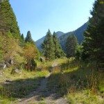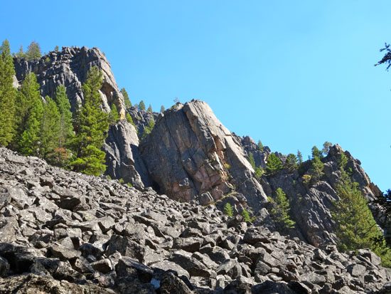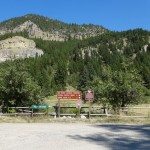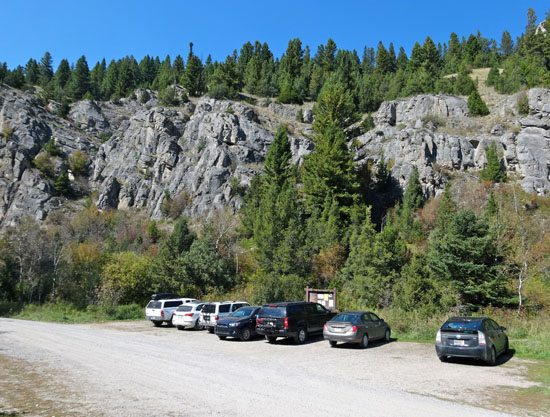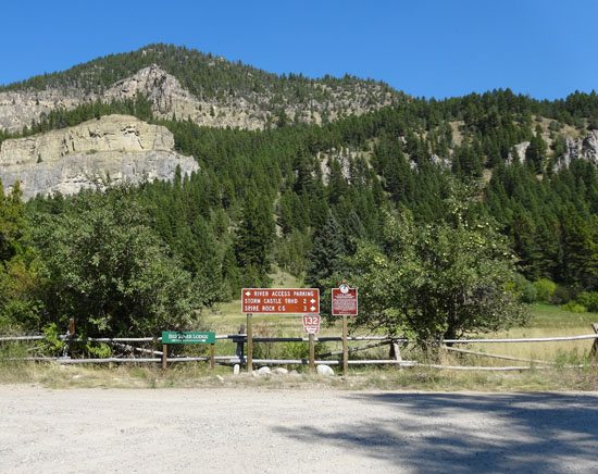 The Storm Castle Trailhead is located in the Gallatin Canyon. As we approached from Big Sky, the Storm Castle turnoff is just after Beckman Flats and 17.2 miles north of the Big Sky turn. It’s well marked and with a quick turn to the east, you will cross the bridge over the Gallatin Canyon. Turn right and follow the well maintained dirt road for 1.8 miles. You’ll quickly pass a helicopter base and a bit later a church camp turn off. The trailhead is located on the south side of Storm Castle peak on the left of the road. Usually it has plenty of parking, but there are several trails, including the Storm Castle Peak Trail, and climbing routes nearby, so it can be crowded. The Gallatin Riverside trail begins on the south side of the road – across the road from the trail info sign.