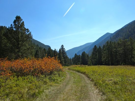 The trail immediately crosses a bridge over Squaw Creek and heads into a thick forest. There is a bit of elevation gain right away as the trail heads up Garnet Mountain. In about a quarter mile the trail forks. An obvious sign shows that the right path leads down to the Gallatin Riverside Trail and the left heads up to Garnet Mountain and the Lookout Tower. Head right and soon a few switchbacks lead down to a large meadow.
