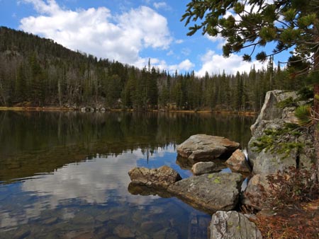 The trail continues to climb steadily uphill for another 1.6 miles. There are several small stream crossings that are easy to rock hop across. After passing a large meadow, the trail climbs steeply toward some large boulders before it levels off for the final approach to the lake.