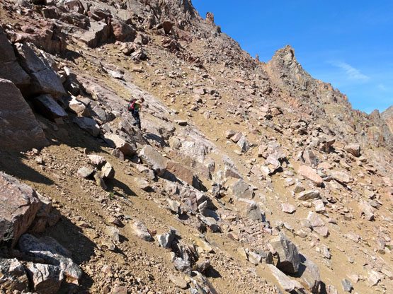 As you can see in our photos, we climbed up loose rocks and slabs toward the gully that has a shadow in it. As we neared the shadow we worked right toward the ridgeline. Then a grassy slope opens up above the exposed gully. A few crux moves with solid hand and foot holds allowed us to cross over the exposure into a steep and loose gully above the shadow.