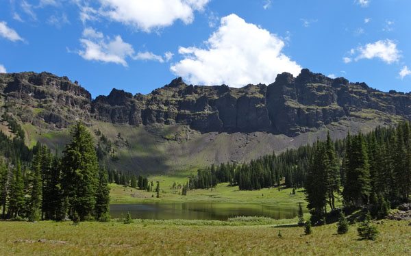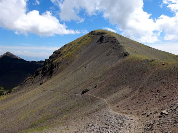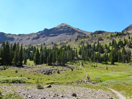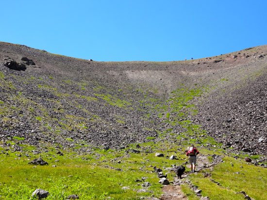 After this the grassy slopes of Hyalite Basin turn into a steep scree field. The trail switchbacks here to the saddle (10,000′) just north of Hyalite Peak. I imagine there could be snow on this headwall until late in the season, but in August it was snow-free.