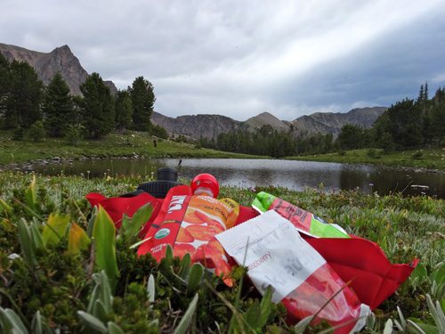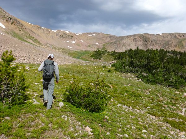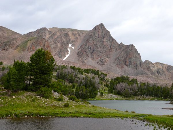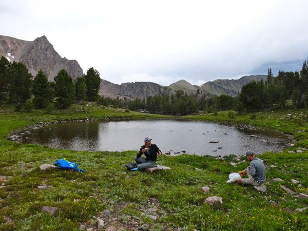 When we hit the wetlands at about 9100′ there seemed to be quite a few trails to follow. It seemed like all of them climbed steadily up toward Alp Lake at about 9700′. We reached Alp Lake in about 3 hours and 7.65 miles. It’s a stunning place to enjoy a snack and a drink of water.