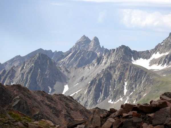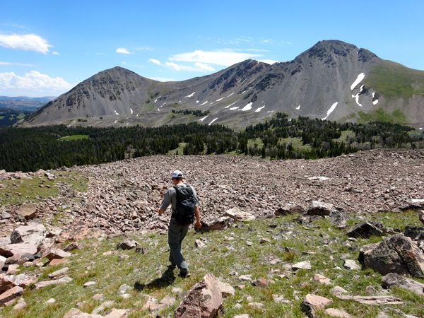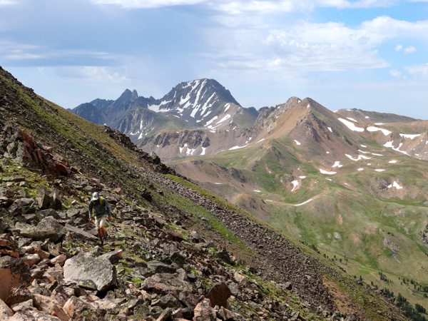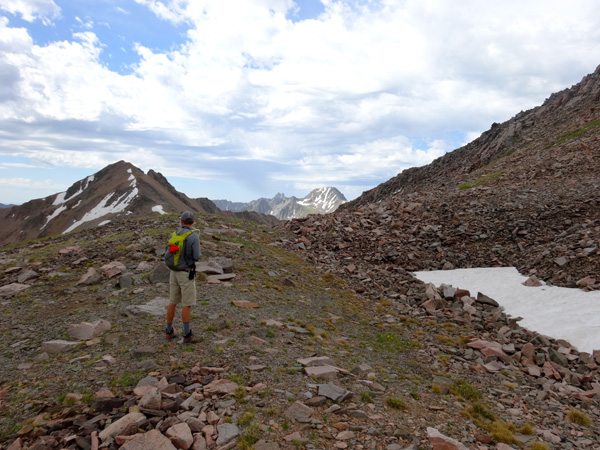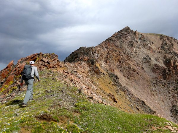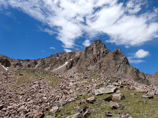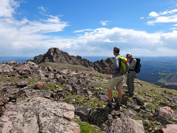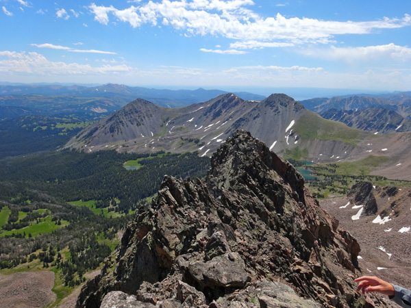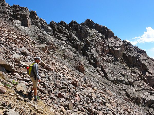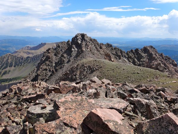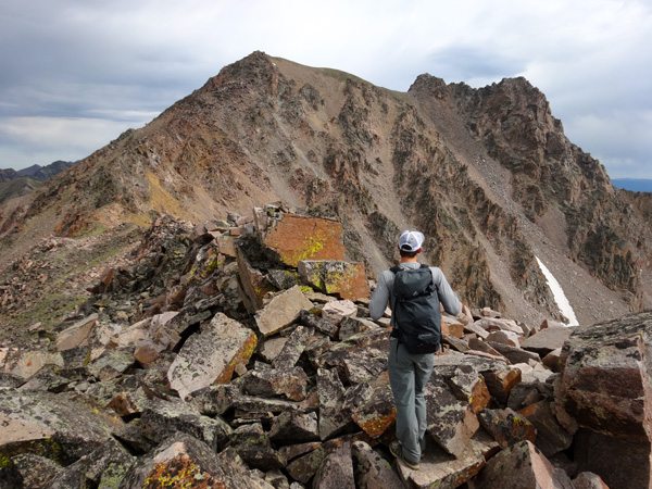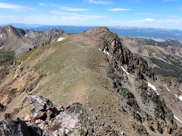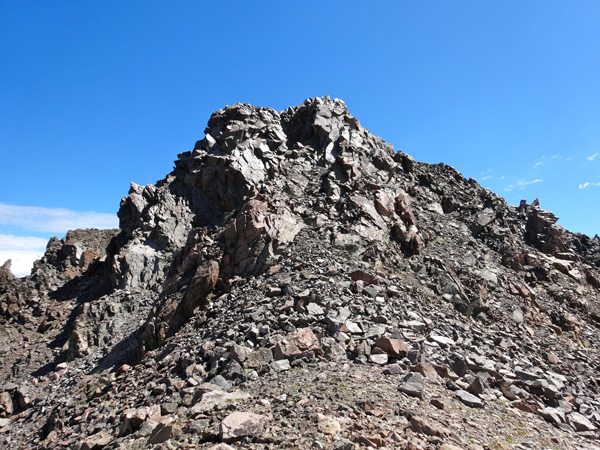 We soon reached the West summit. It had taken 4 hours, 40 minutes, 9.25 miles, and 4325′. The west summit is marked as 11,202′ on most maps. We enjoyed a snack while looking over at the East Summit. This more prominent horn appears taller so we crossed the broad ridge and climb it too. The East Summit is definitely more rugged and is covered in loose rock and choss. It’s still an easy climb, but watch for falling rocks.