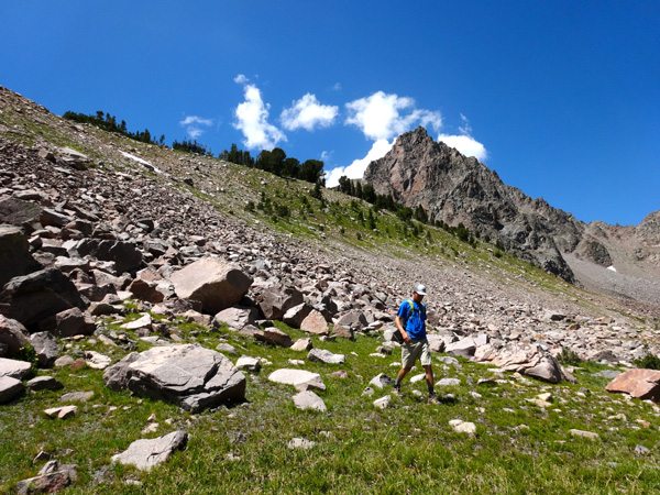 Ever since laying eyes on Imp Peak from the summit of Koch Peak, I’ve wanted to climb it. Finally, on a stunning July day, Kevin Chartier and I set off to climb Imp Peak. Our planned route was to park at the Upper Taylor Fork Trailhead (7250′). Then hike in via the Lighting Creek Trail #7, then follow the Alp Creek Trail #158 to Alp Lake, and then make a summit attempt via the South Ridge.