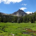 We did not cross the creek and followed a faint trail across the meadows toward Pyramid Point. At the far end in of the meadow in some old growth trees is an established horse camp. The trail continues on as it weaves through meadows and forests. It fades in and out, but it’s easy to track the horse prints that are en route to Alp Lake.