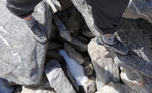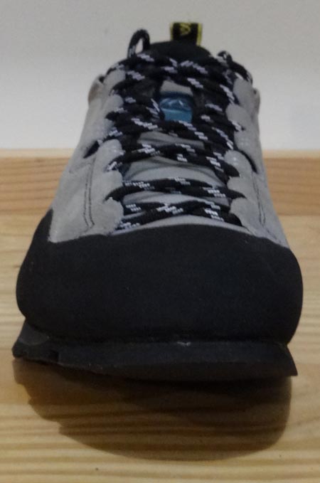 Let’s take a closer look at the La Sportiva Boulder X. A durable rubber rand, sole, and tread wraps around the entire lower portion of the shoe. It supplies the shoe with super grippy “Vibram® Idro-Grip V-Smear™ Impact Brake System™”, which is “sticky when wet.” It also makes it ideal for water resistance on the hike in. The grippy rubber allows the shoe to edge and smear well for an approach shoe. It’s good to note that the La Sportiva Boulder X is neither a climbing shoe or a hiking boot.