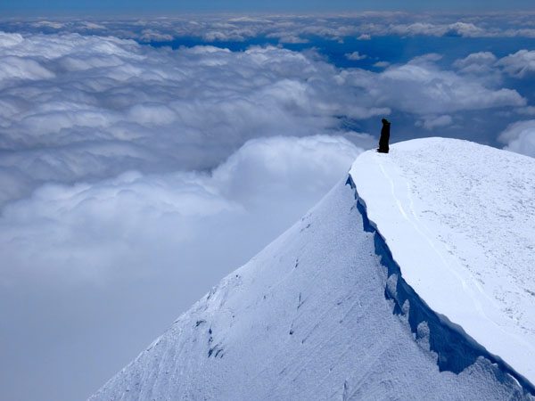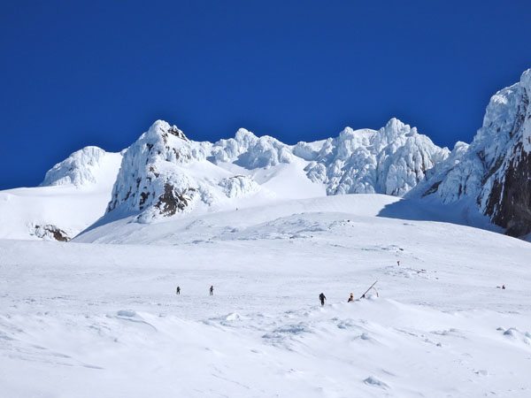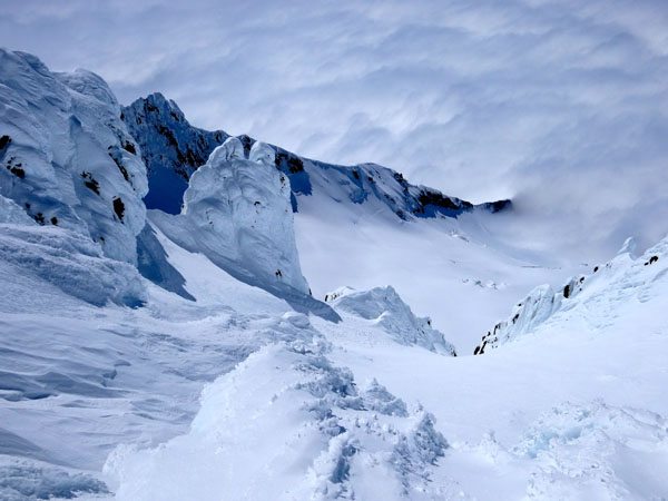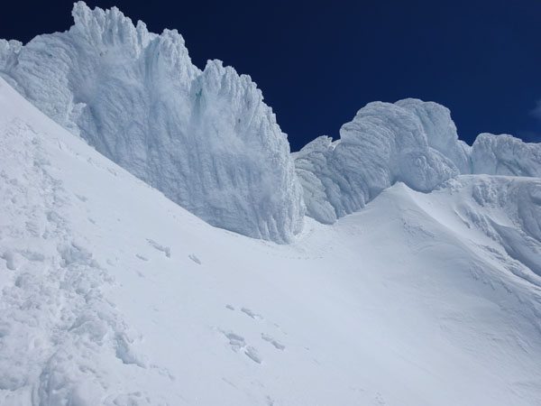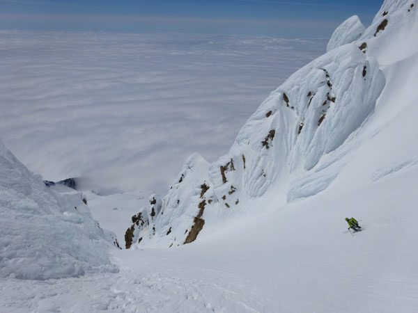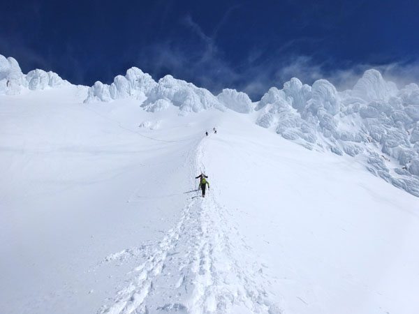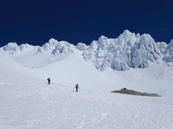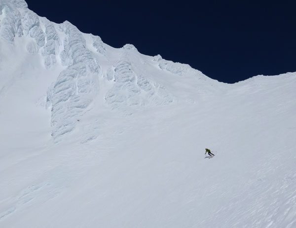 The rimed features of this stunning stratovolcano were like something from another world. It was mind blowing. At the top of the Leuthold, we switched to downhill mode – what a cool place to ski. The top few turns above the Queens Chair were rough, firm, rimed, and wind effected. It only got better from there.