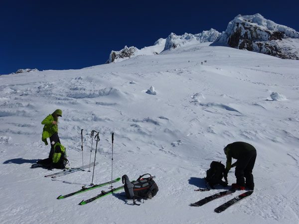 On the exterior ground floor of the Wy’East Day Lodge is a climber’s self registration. Stop by and read the rules, get the latest beta, and register your climb. Also grab so blue bags. In the adjacent parking lot, we packed up our packs with axes, crampons, skins, ski crampons, 40 m rope, and standard glacier kit – and of course snacks too. Everyone needs snacks in the mountains.
