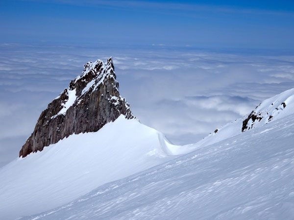 Hunkered down in the drizzle of the PNW, we made a plan for the next day to ski the Leuthold Couloir on the west face of Mount Hood. Mount Hood is an active stratovolcano in the Cascade Range of northern Oregon. It is the highest point in the state at 11,249′ and is called Wy’East by the Multnomah tribe.