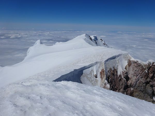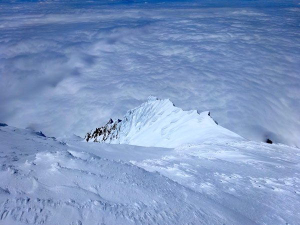 The route was busy for April. We passed lots of people epic-ing Mount Hood. Between the drifting scent of sulfur and a steady pace, we quickly reached the top in just over two hours – 2,800′ above the Palmer Chair. The rimed up Pearly Gates was the crux of the ascent, but it was not bad at all. We chose the climber’s left Gate and it was nice to have crampons and an ax for this section.