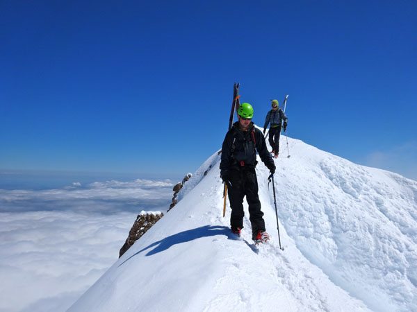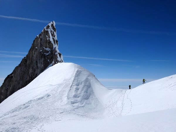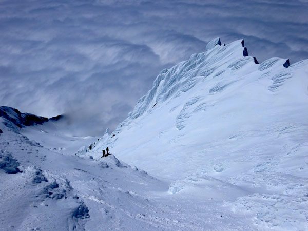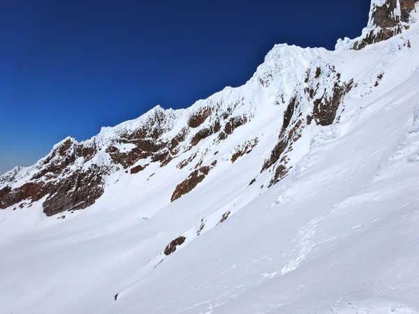 Finally we decided to venture on the ridge in crampons to the west to the entrance of the Leuthold Couloir. The ridge walk isn’t bad, but the drop offs could be intimidating to some people.