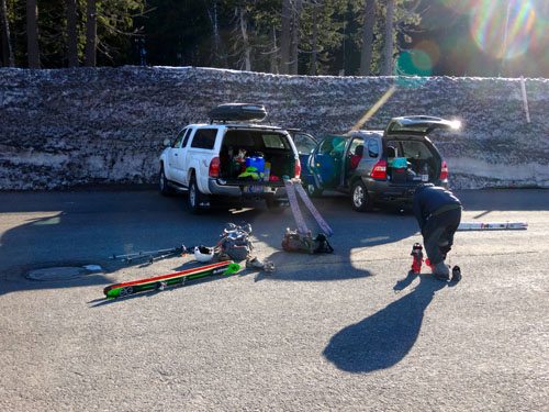 Chris Ebeling, Jeremy Wood, and I cruised south from Mount Saint Helens along OR 35. As we laid eyes on the Newton Clark, we knew we were in for a cool skiing adventure. It was late when we pulled in to the parking lot at Mount Hood Meadows. We got a good look at our route before the sunset. Parking overnight is allow in the main parking lot of Mount Hood Meadows, but we decided to camp in our trucks down at the Bennet Pass Sno Park where there was an outhouse and decent cell service.