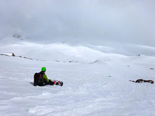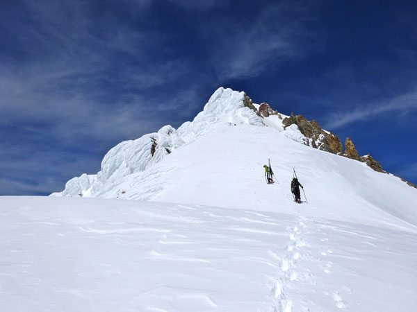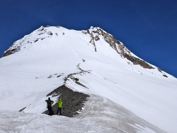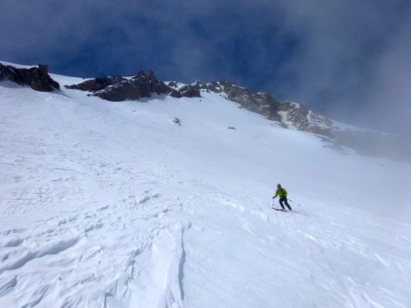 As we approached the Newton Clark Headwall, we peered down several different potential ski lines – all of them cliffed out. In fact it’s a bit confusing to actually find the correct line up there. Our plan was to summit Hood and then ski the route Sylvain Saudan had skied, but that route didn’t seem to go cleanly. It could have been climbed, but a clean ski from the summit didn’t seem to be possible. Maybe with a rope…