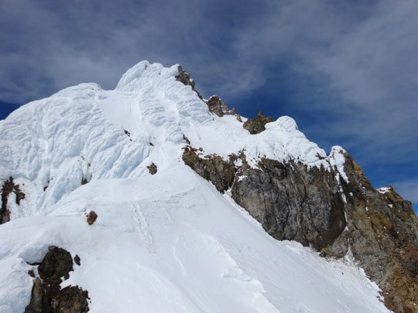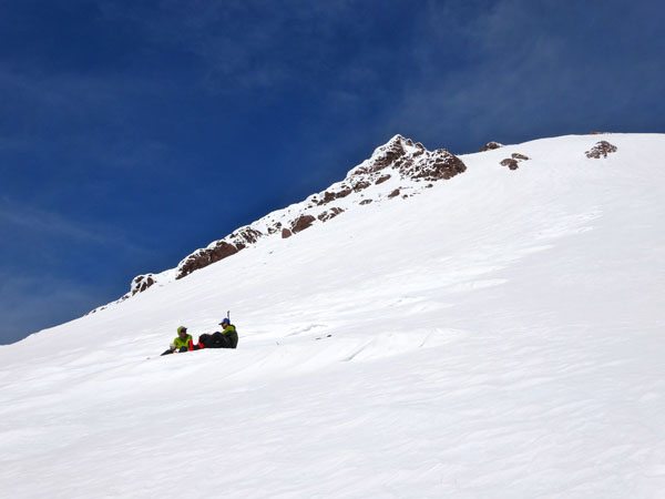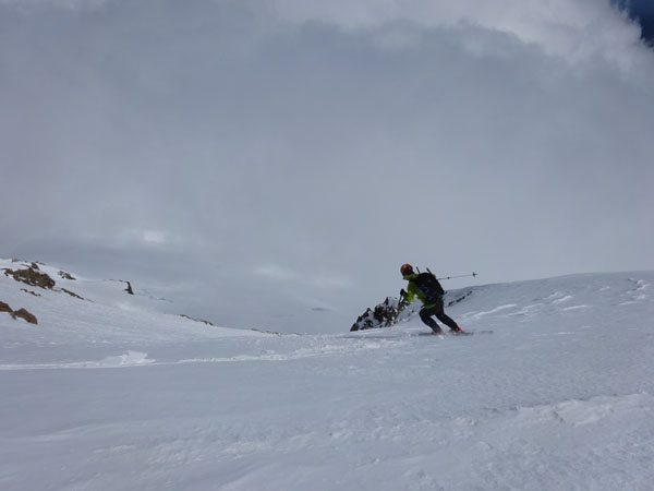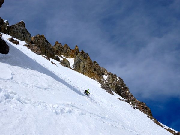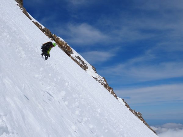 Instead we skied from 10,865′ (about 400′ short of the summit) at the bench above the Newton Clark Headwall. It was steep – pushing 50 degrees and a little bit puckering. The headwall was sustained for about 1500′ and then mellowed out into the crevasses of the Newton Clark Glacier. It’s a no fall zone.