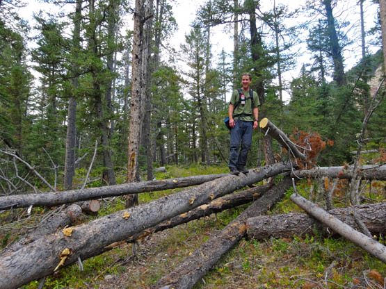 This is where the adventure really began. Due to reasons unknown to us, there were hundreds of downed trees that had fallen across the trail. Literally hundreds of large obstacles that we had to climb up, tip toe along, scoot under, or bushwhack around. The worst of it was over by the time we crossed No Man Creek around 7800′.