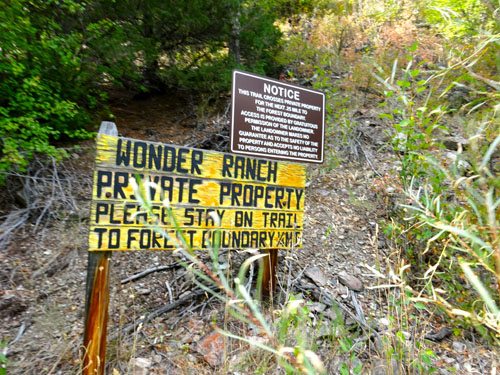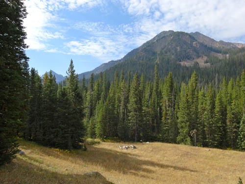 We pulled into the large Indian Creek Trailhead parking lot at 6078′ and parked the van. It is not located in the same place that most maps mark it – most likely due to private land easements in the area. We geared up, used the outhouse at the parking area, and hit the trail. Sticking to the trail across the private land, we gained a bit of elevation, crossed a field, went through a gate, and dropped down to a road that parallels Indian Creek. We soon crossed the creek on a bridge and walked through the grassy yard of the Wonder Ranch.